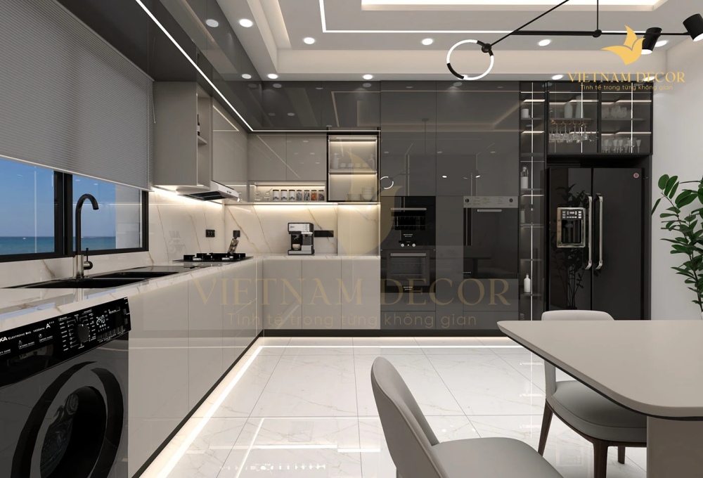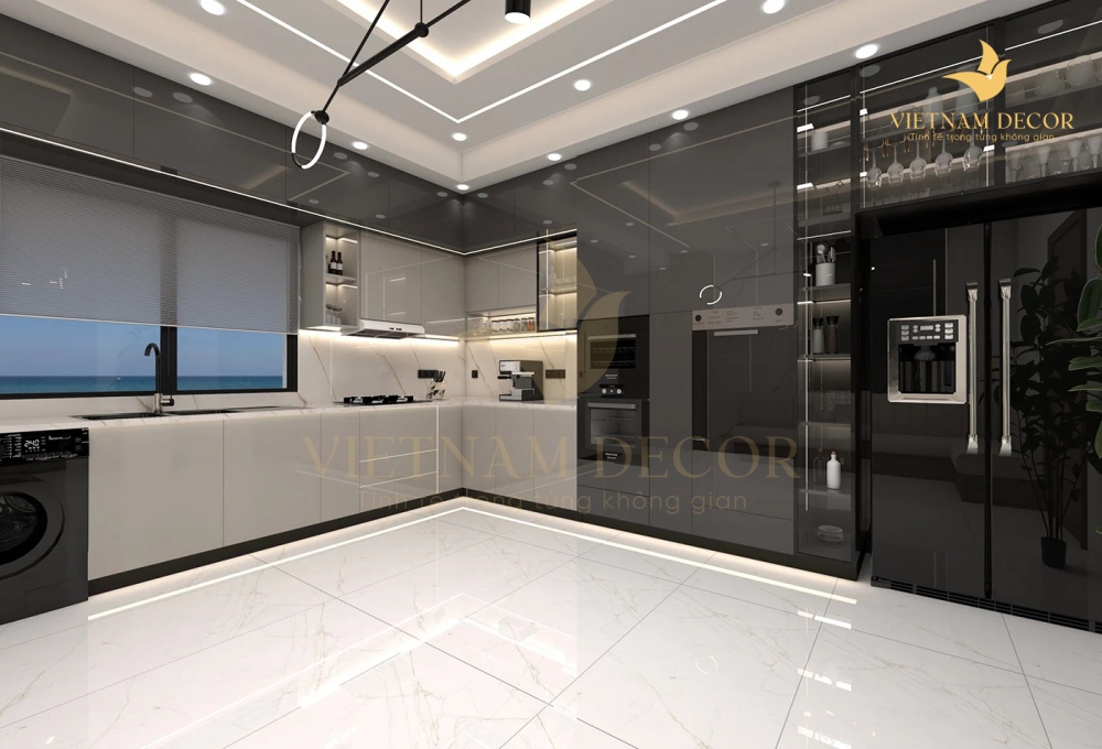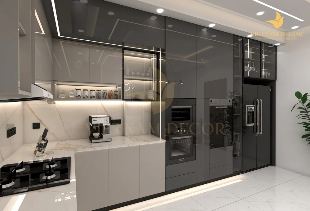 • Thiết kế: Tủ bếp chữ L hiện đại, sang trọng