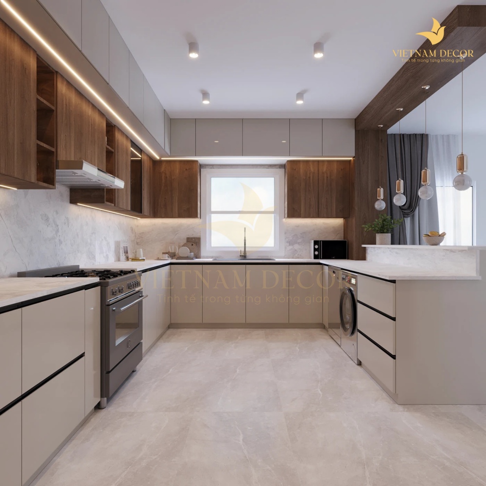 Thiết kế chữ U tiện nghi, khoa học: Bố cục chữ U giúp tận dụng tối đa không gian bếp, phân chia rõ ràng các khu vực lưu trữ, sơ chế và nấu nướng. Điều này mang lại sự thuận tiện tối đa trong quá trình sử dụng, đặc biệt phù hợp với những gia đình có nhu cầu nấu ăn thường xuyên.