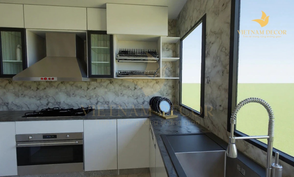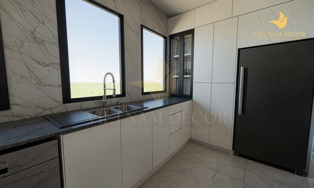 • Thiết kế: Tủ bếp chữ U hiện đại sang trọng, tone màu be tinh tế